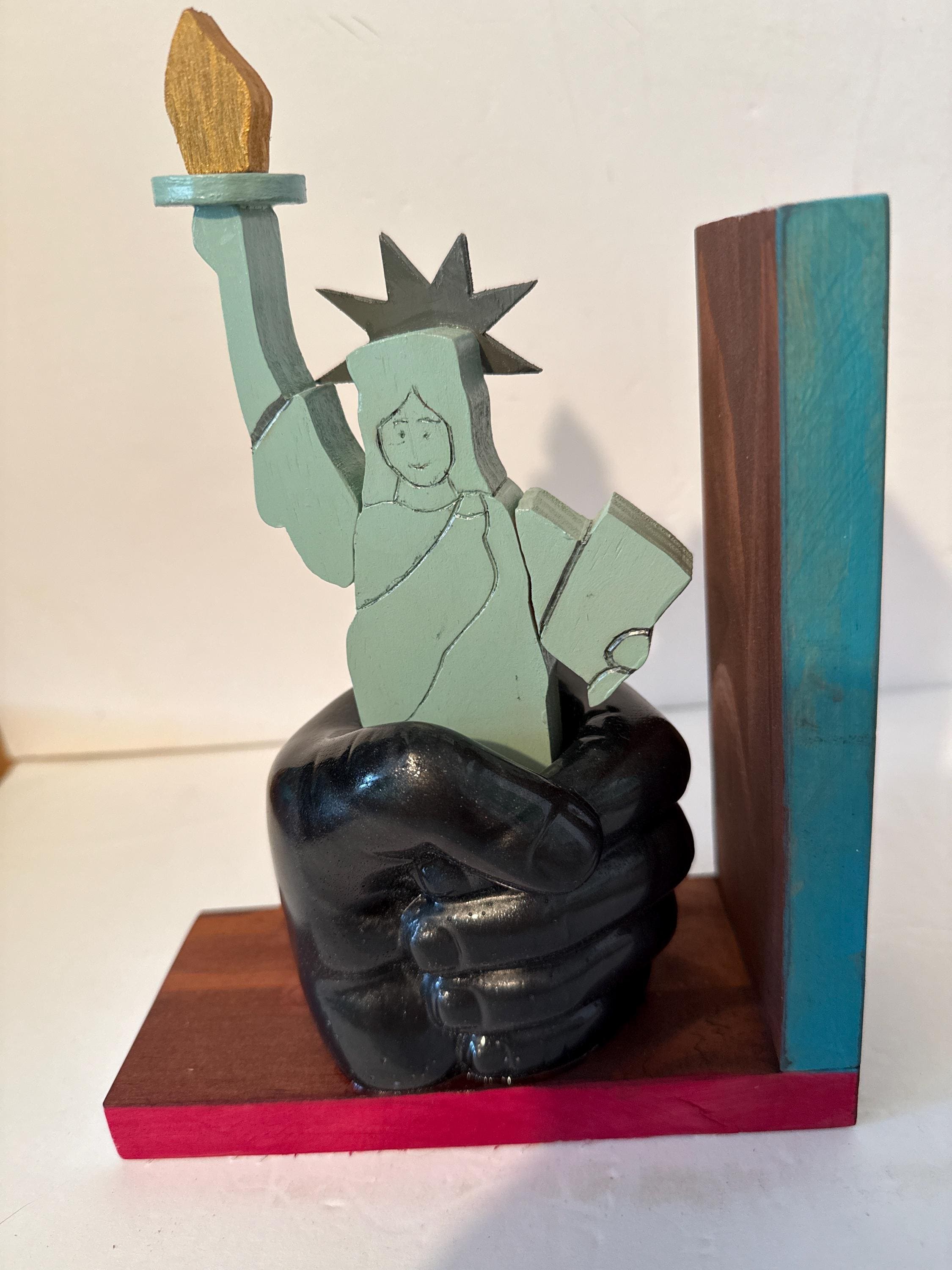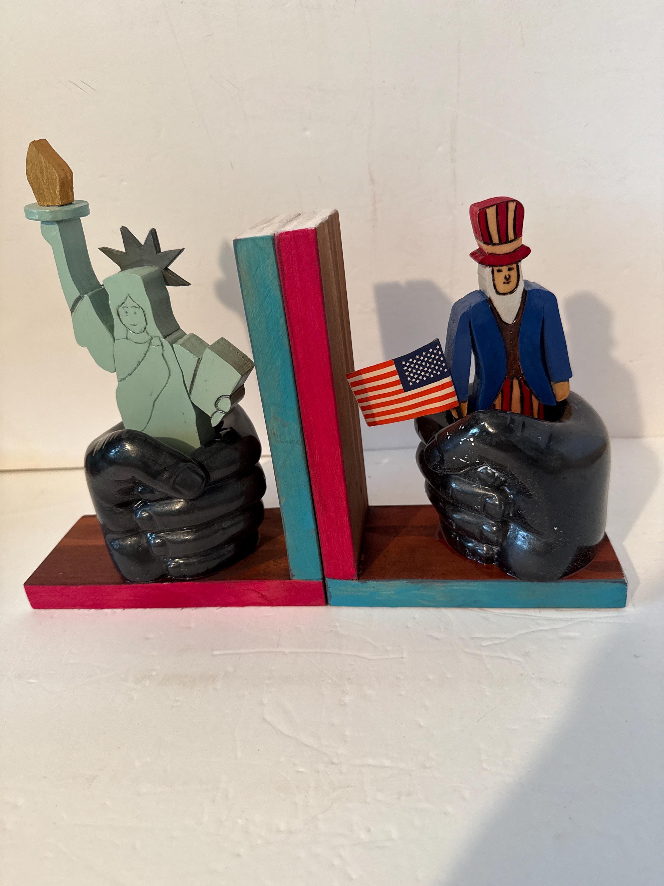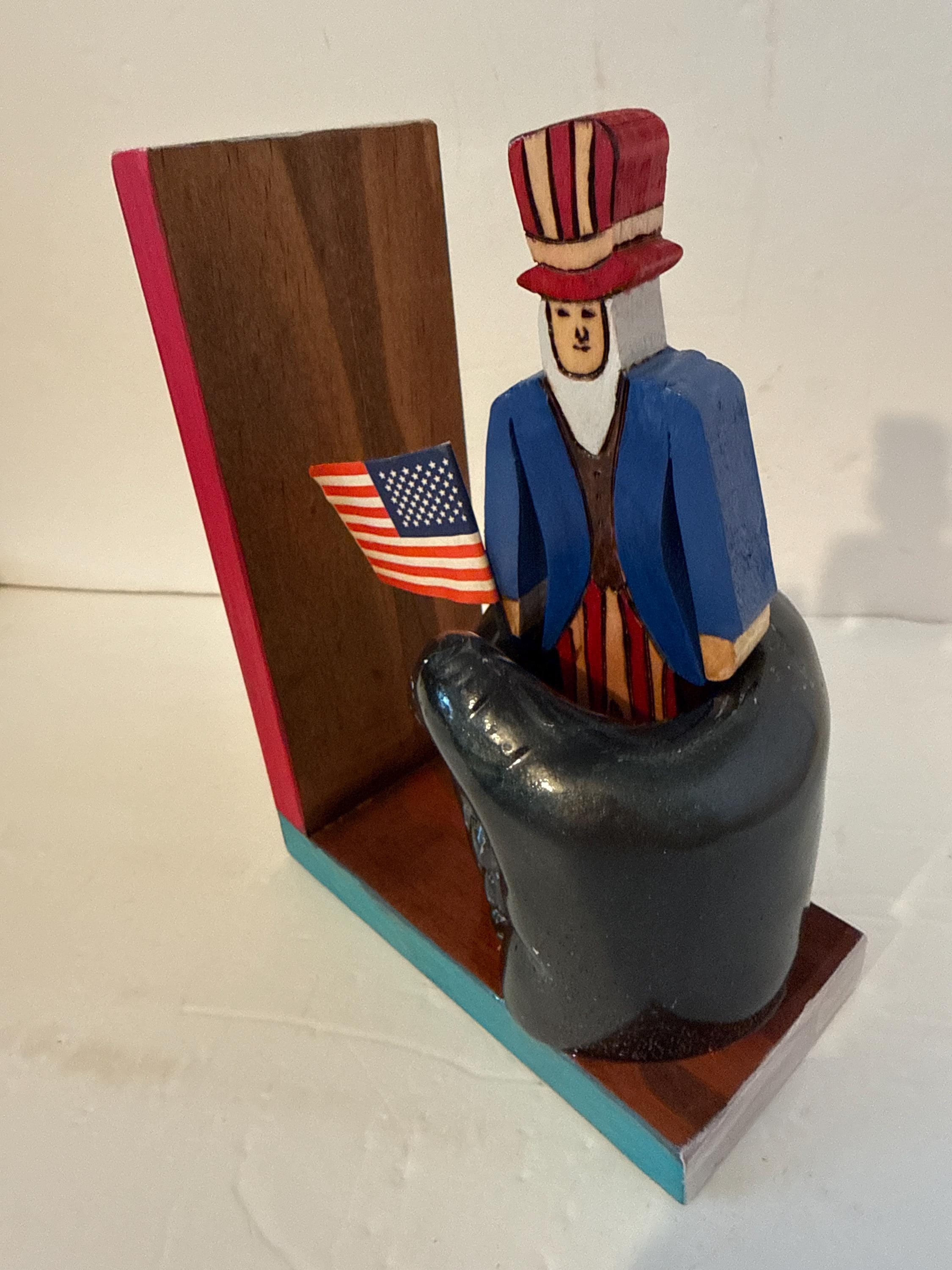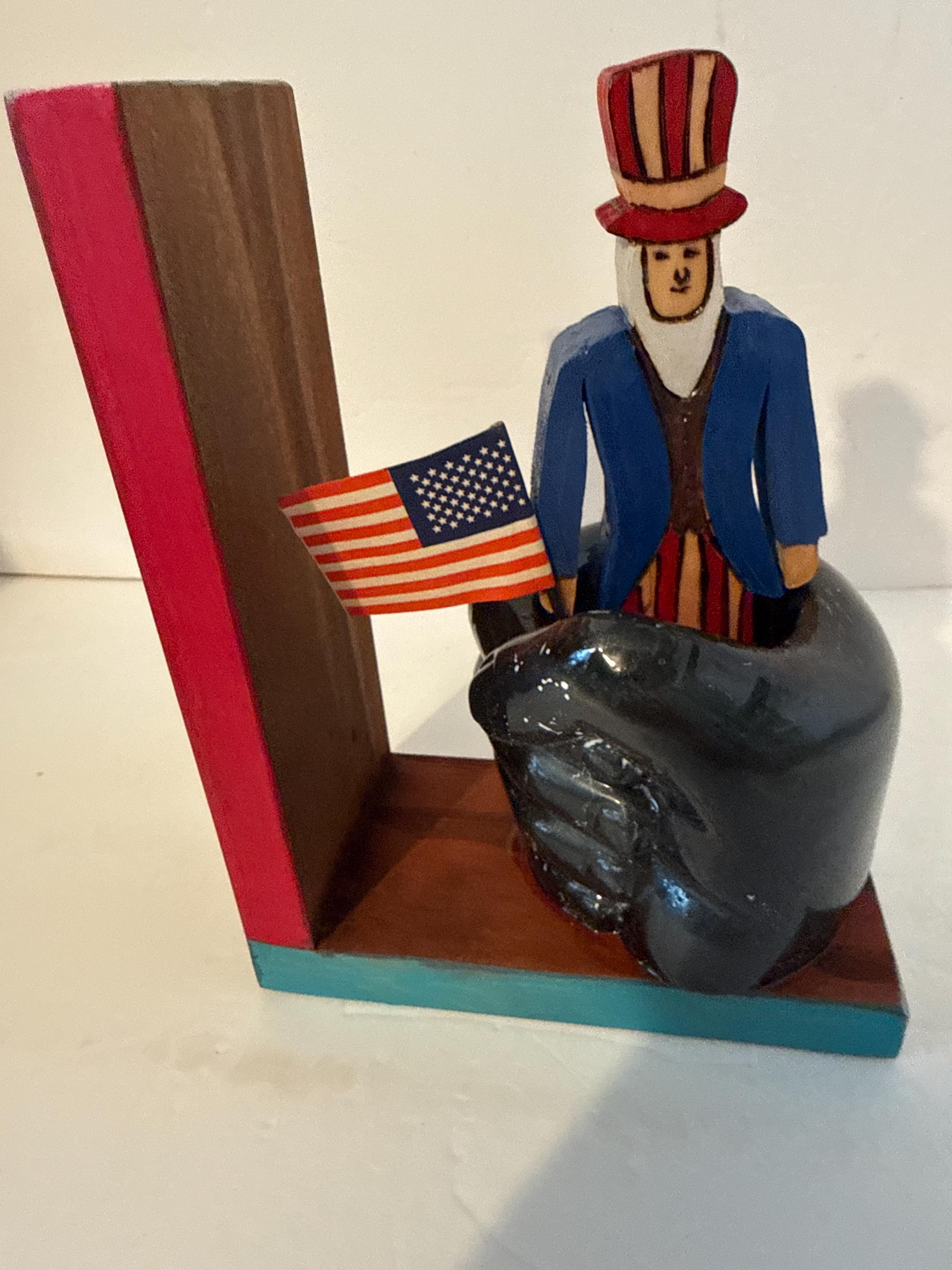This is a whimsical, hand-crafted, epoxied bookend representing Uncle Sam and Lady Liberty in the hands of “god”. This would be a neat gift for someone who is “Patriotic”. The shapes are made of a single piece of wood, and the hands are made from epoxy resin. The wood has been stained, painted, glued, nailed, and varnished. The detail has been added by hand with a wood burning tool. The bases have also been sanded, painted, and varnished.