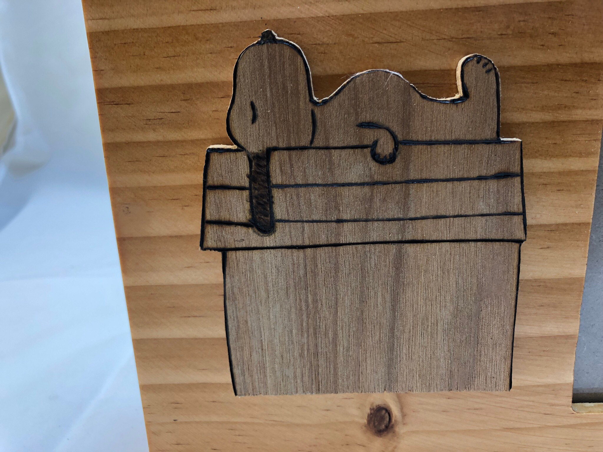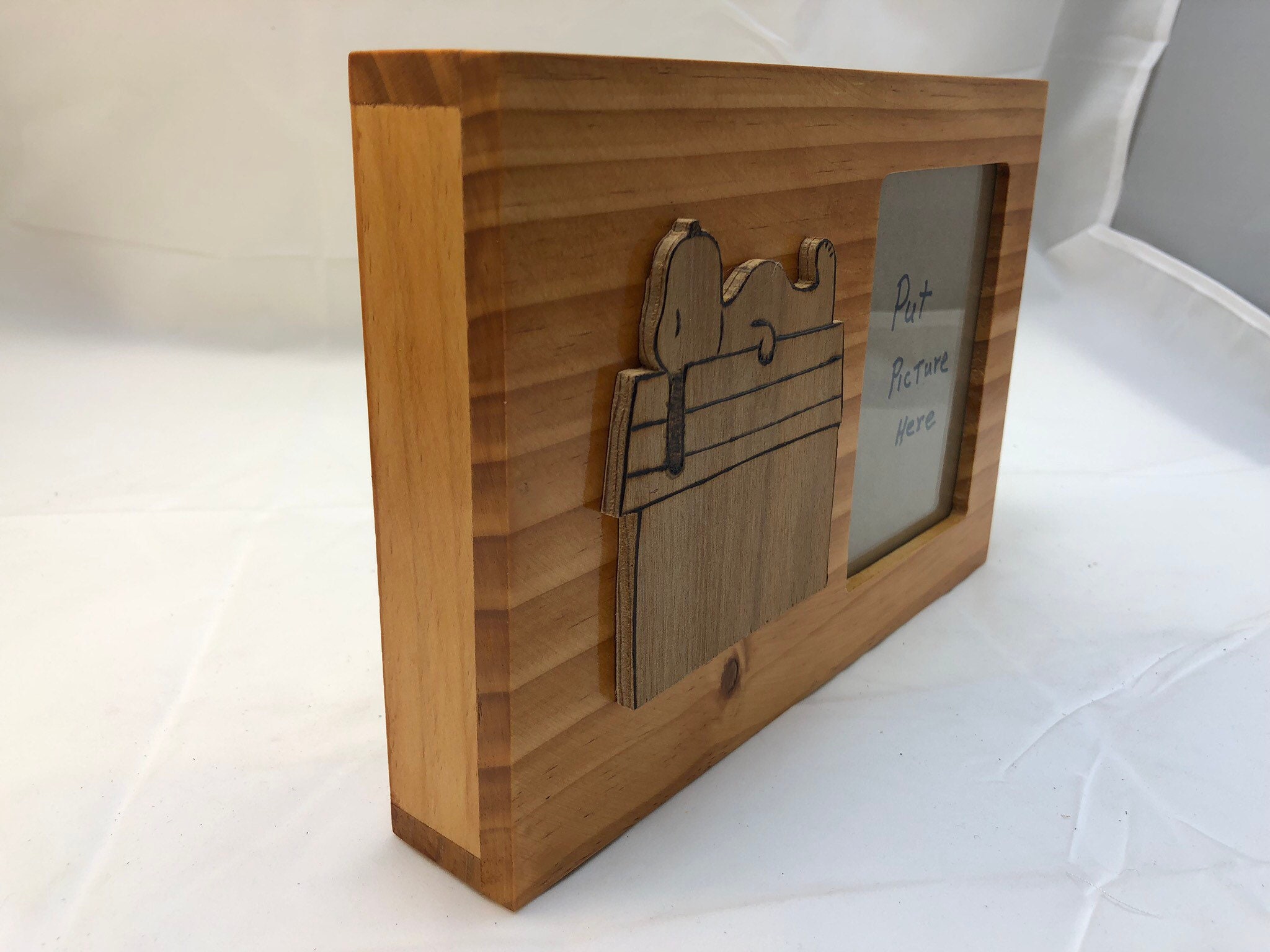 This is a hand-crafted wooden picture frame containing a cutout of an image of Snoopy resting on his dog house, and an opening where you may place a picture of your choosing. Snoopy was cut to shape, sanded, and stained by hand. He is glued to the front of the picture frame with craft glue. The picture is protected by the glass window.
