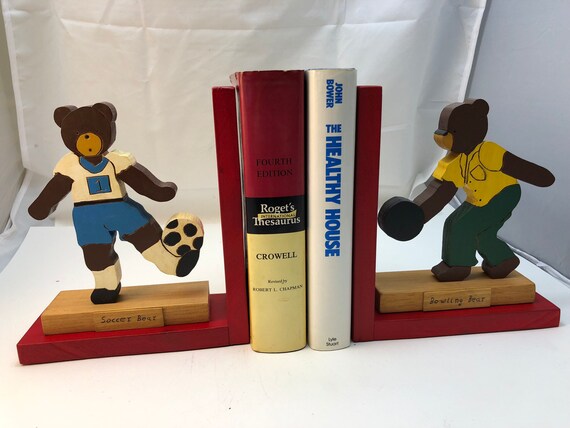 Hand-Crafted Wooden Bear Bookends: Soccer Player & Bowler
